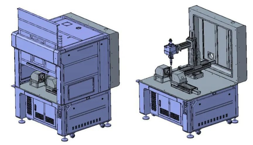 As shown in Figure 3, the laser welding machine is mainly composed of X, Y, Z three axes and rotating axes, laser, closed cover, etc. The welding of workpieces is realized by manual loading and unloading. This special welding machine is mainly suitable for the welding of small kitchen utensils with a single welding seam. The rotating shaft is equipped with different fixture systems to adapt to a variety of workpieces, with high flexibility.