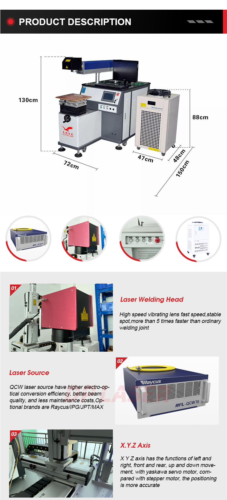 1. Mainly composed of laser, power supply and control, cooling machine, light guiding and focusing, and binocular reflection microscopic observation, compact structure and small volume.